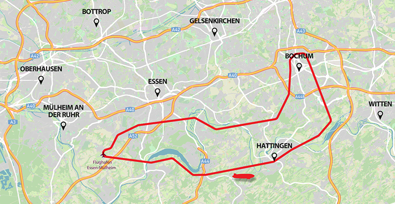 | Orte*: | Baldeneysee, Villa Hügel, Altstadt Hattingen, Burg Blankenstein, Kemnader See, Ruhr Universität, Bochum City, Deutsches Bergbau-Museum, Bermuda-Dreieck, Exzenterhaus, Sternwarte Bochum, Essen, Gruga Messe * * Die Rundflüge starten ab dem Flughafen Essen/Mülheim. |