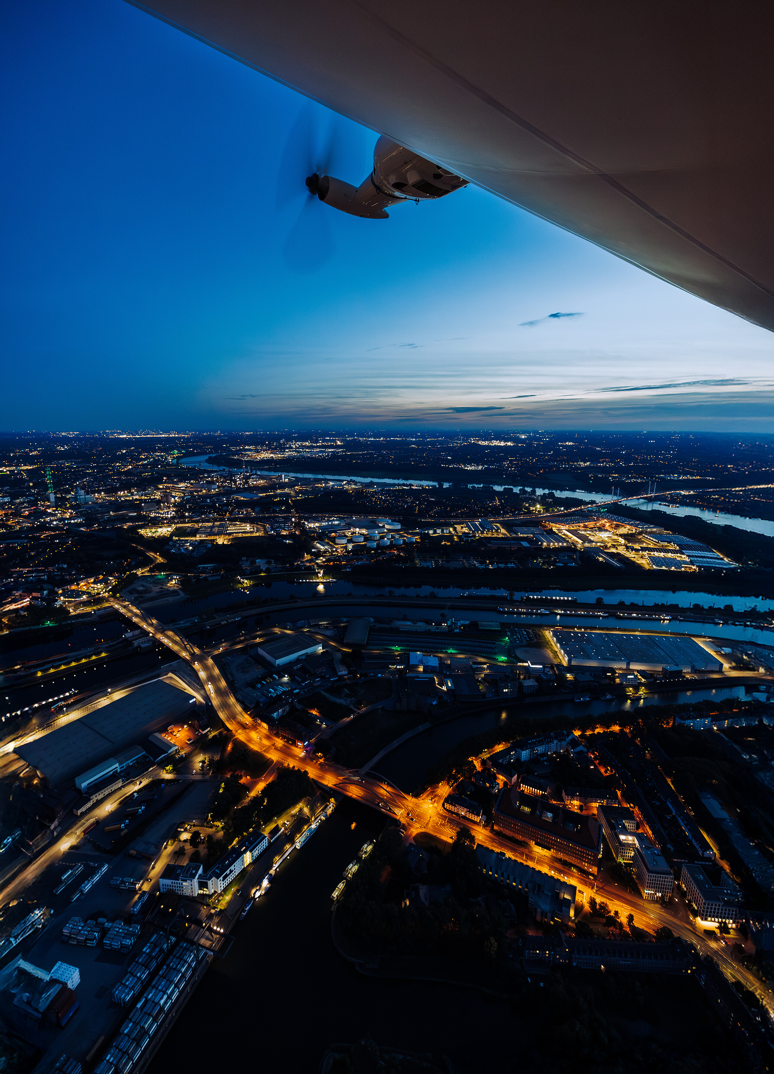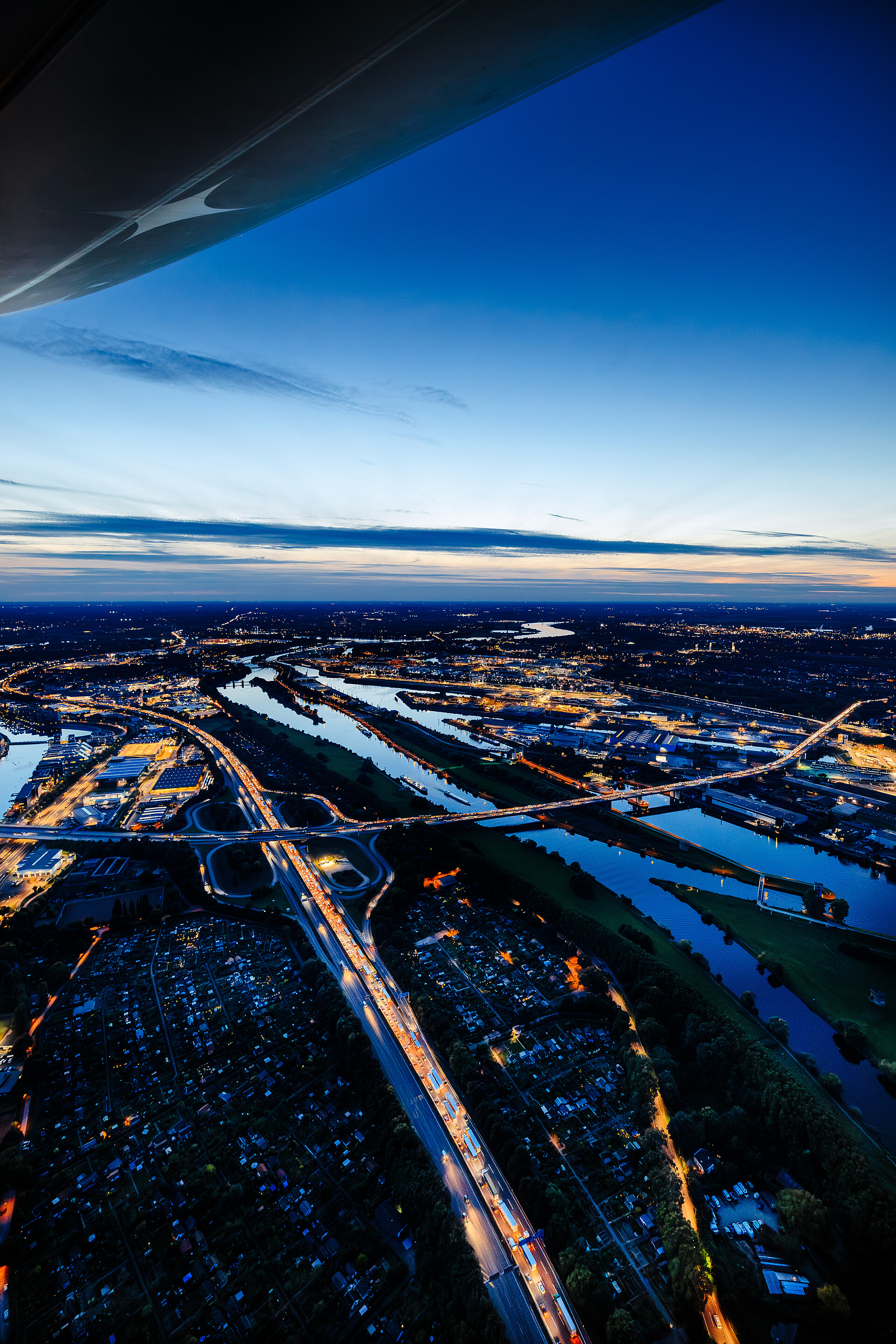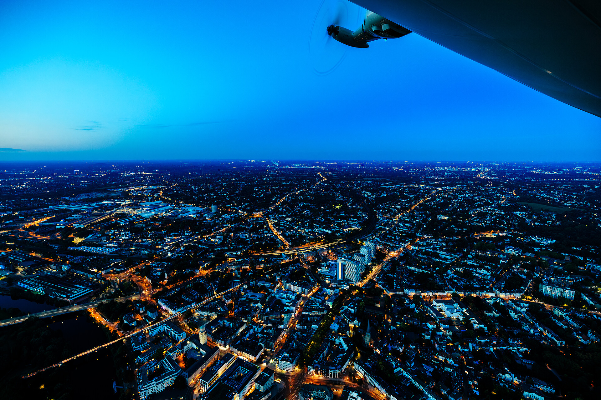 Departure is from Essen-Mülheim airfield as day fades into the blue hour. From there you glide over Mülheim’s old town, past Broich Castle and Styrum Castle, to the Old Ruhr River and Mülheim Harbor.